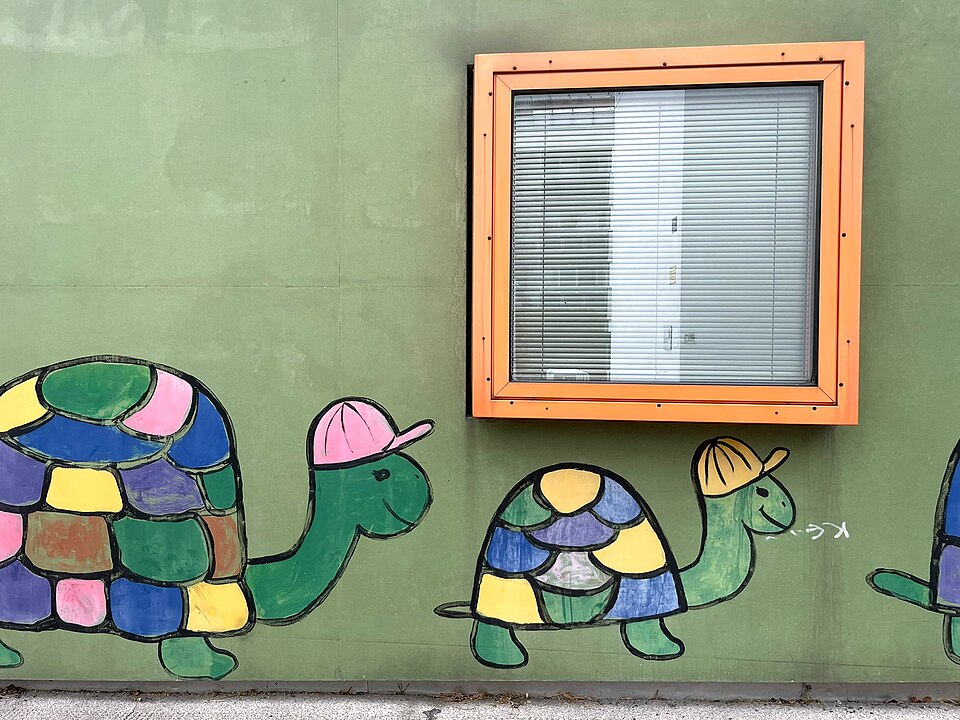 Volksschule Schumpeterweg 3, 1210 Wien (KG Stammersdorf), Fassadendetail mit schräg heraustehendem Fenster