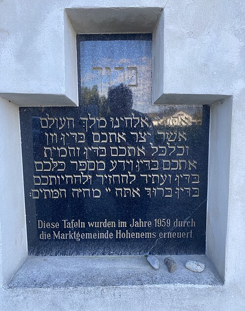 | aktuell | 09:51, 1. Okt. 2024 | 3.024 × 3.831 (2,93 MB) | commons>Ernst Heim | {{Information |Description=Gebetstext Jüdischer Friedhof Hohenems |Source=eigene |Date=2024 |Author=Ernst Heim |Permission= |other_versions= }} |