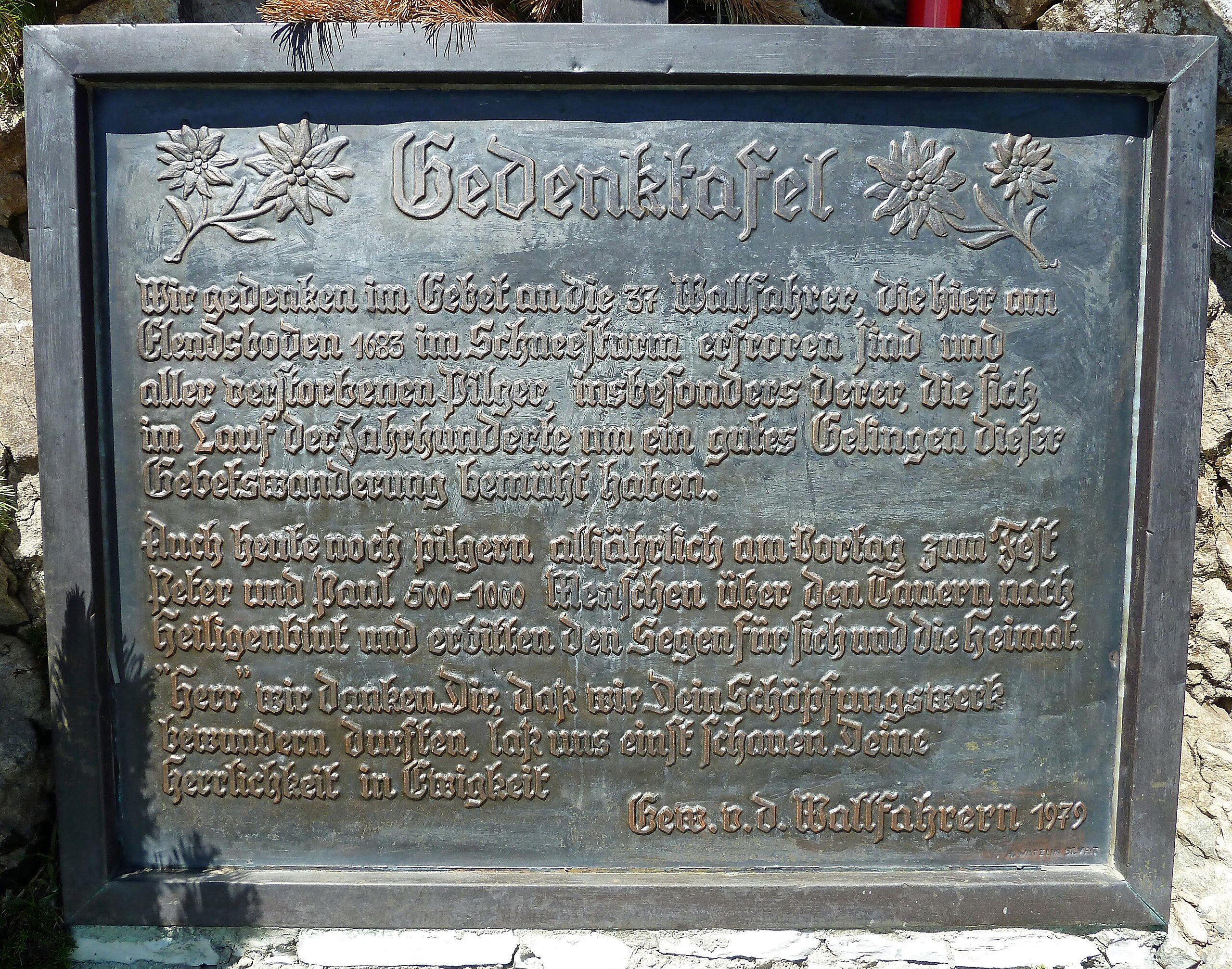 | aktuell | 21:32, 8. Okt. 2016 | 3.666 × 2.884 (3,18 MB) | commons>Wald1siedel | {{Information |Description ={{en|1=Memorial, Elendboden, Großglockner Hochalpenstraße, Salzburg (state), Austria.}} {{de|1=Gedenktafel am Elendboden an der Großglockner Hochalpenstraße, Gemeinde Fusch an der Großglocknerstraße, Land Salzburg,... |