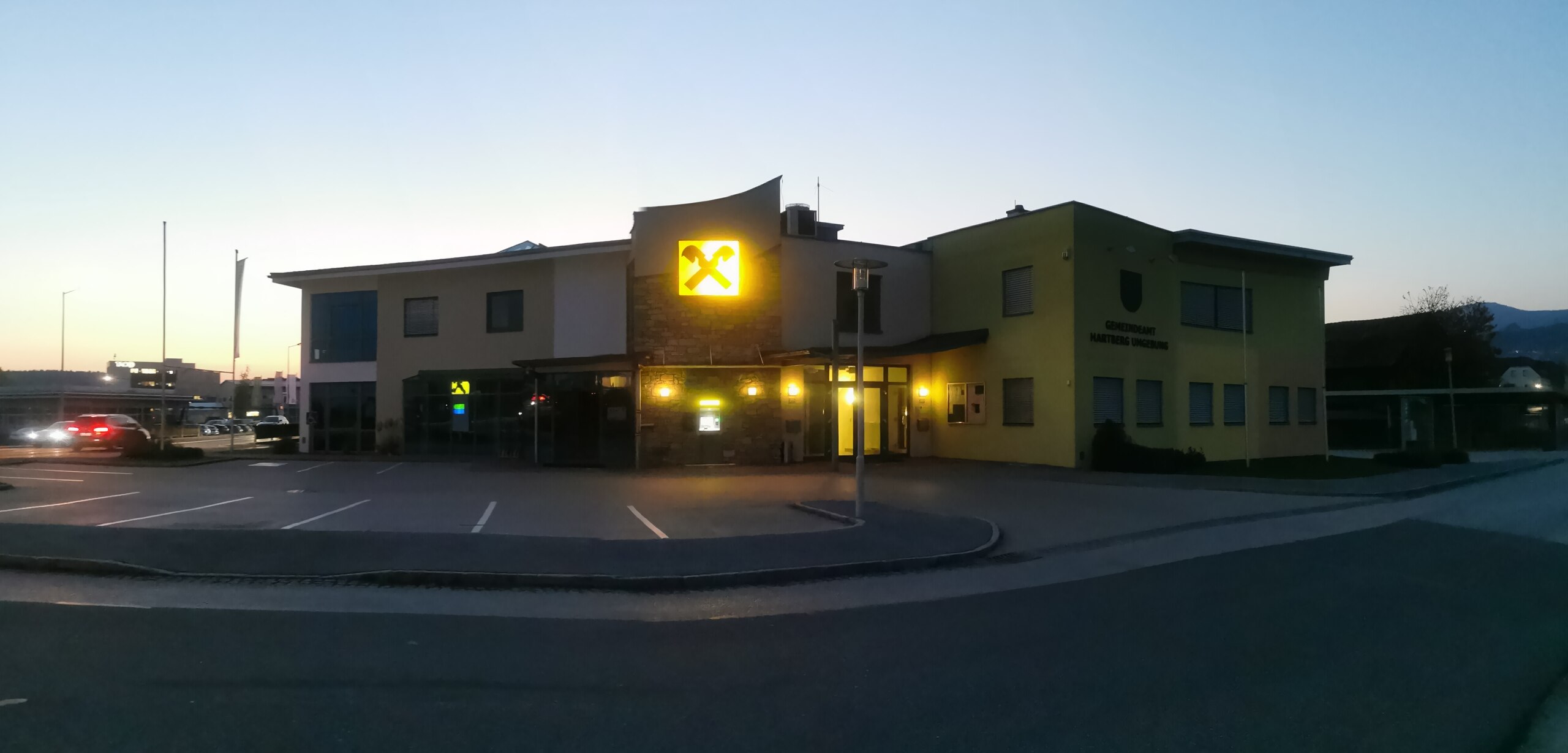 Deutsch: Das Gemeindeamt von Hartberg Umgebung mit der ehemaligen Raiffeisenbank an einer Kreuzung neben der Wechselstraße B 54