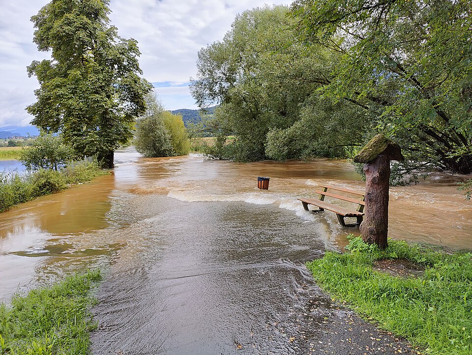 Deutsch: hochwasserführende Glan bei Aich, Gemeinde Sankt Veit an der Glan, August 2023.