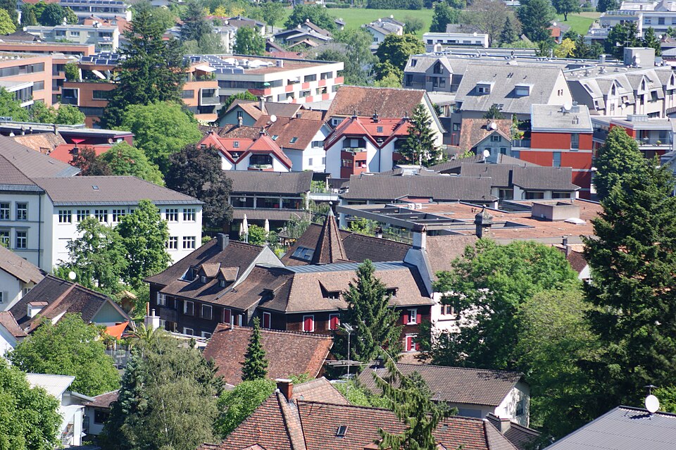 English: Josefsheim in Goetzis, Vorarlberg, Austria. View from the Neu-Montfort ruin (castle).
