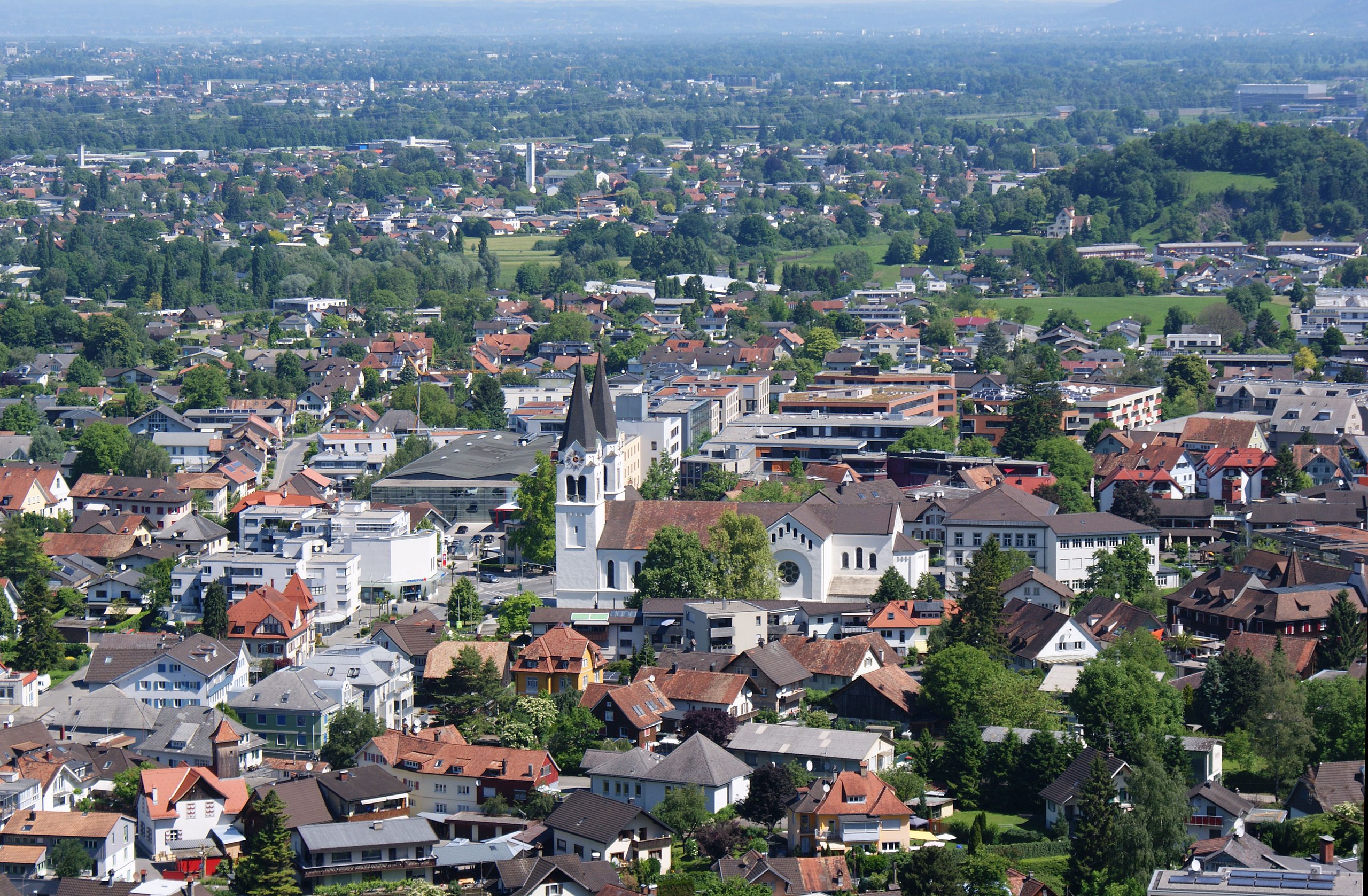 A part of Goetzis and new parish church of St. Ulrich in Goetzis, Vorarlberg, Austria
