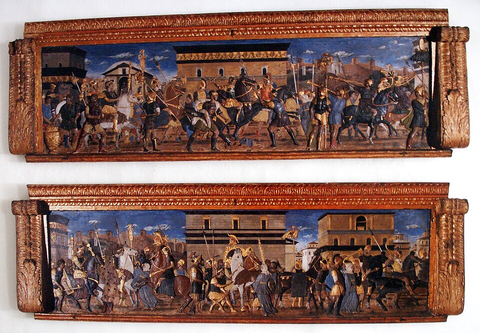 Deutsch: Vorderseiten-Reliefs zweier Brauttruhen (Cassone) entworfen von Andrea Mantegna und Bartolomeo Melioli, die Teil der Mitgift der Tochter Paola Gonzaga des Herzogs Ludovico II von Mantua waren, die am 15. November 1478 in Bozen mit dem Graf Leonhard von Görz auf Schloss Bruck bei Lienz (Osttirol) verheiratet wurde.[1] In der Inventarliste (Kopie im Stiftsmuseum Millstatt) sind vier Truhen verzeichnet, wovon drei erhalten sind. Diese Reliefs gehören zu den beiden größeren Truhen, an deren Vorderseiten Pastiglia mit der Darstellung von Trajans gerechtem Urteil angebracht waren. Nach 1495/96 gelangten die Truhen in den Besitz des St. Georgs-Ritterordens im Stift Millstatt (Kärnten / Österreich), ab 1598 an die nachflogenden Jesuiten. Die Reliefs dieser Truhen wurden 1869 vom k.k. Finanzministerium dem Geschichtsverein für Kärnten geschenkt. Eine Truhe ging zugrunde, eine blieb in Millstatt erhalten und ist im Stiftsmuseum ausgestellt. Die Originale befinden sich im Landesmuseum Kärnten. |
