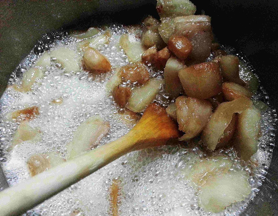 Deutsch: 2 Kg Schweinespeck während des Ausbratens-Auslassens zu Grammeln und Schmalz - Fetttemperatur ca. 160 Grad |