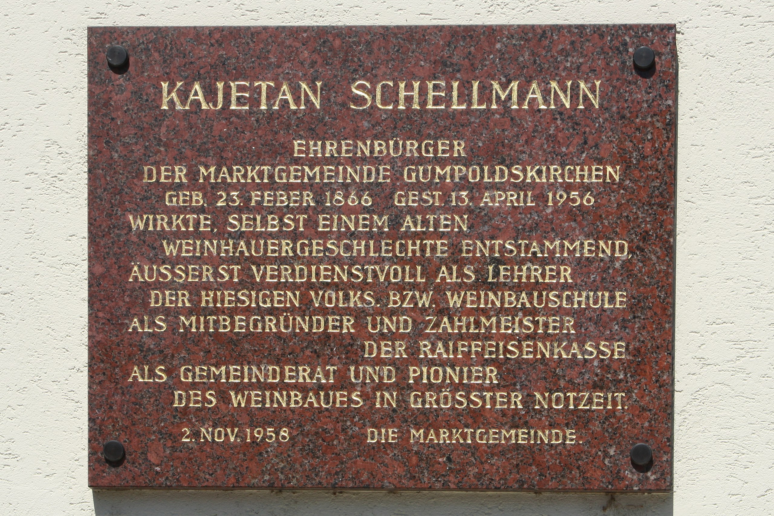 | aktuell | 18:39, 28. Okt. 2016 | 3.360 × 2.240 (3,47 MB) | commons>Karl Gruber | == {{int:filedesc}} == {{Information |Description={{Commonist}} {{de|Tafel für Kajetan Schellmannin de:Gumpoldskirchen}} |Source={{own}} |Date= 2011-06 |Author=Karl Gruber |Permission={{User:Karl Gruber/Credits}} |other_versions= }} {{RegiowikiAT... |
