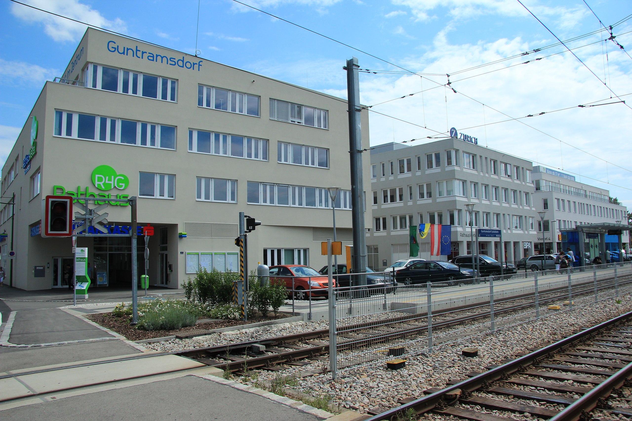 Deutsch: Rathaus und Badnerbahnstation in Guntramsdorf, Niederösterreich |