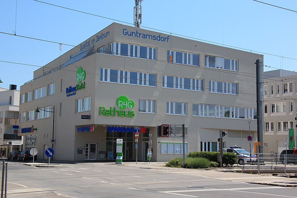 Deutsch: Polizeistation und Erste Bank im Rathausviertel in Guntramsdorf, Niederösterreich |