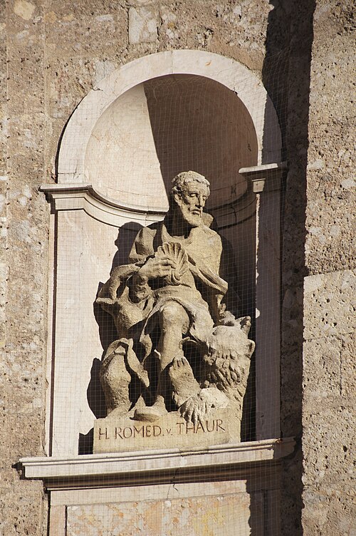 Deutsch: Statue des hl. Romedius an der Fassade des Doms zu St. Jakob, Innsbruck |