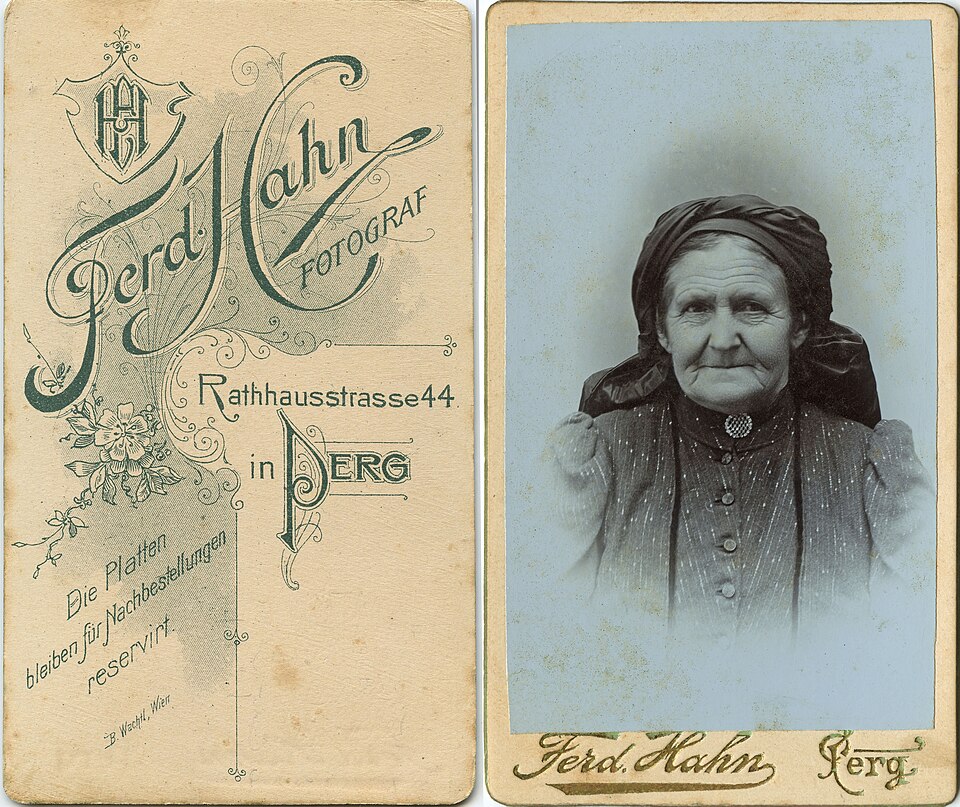 | aktuell | 07:48, 27. Apr. 2022 | 5.890 × 4.950 (4,09 MB) | commons>TREM-RRRR | {{Information |Description=Johanna Leherbauer, geborene Greisinger. Geboren 18.5.1819 in Perg. Gestorben 23.4.1908 in Perg. Perg in Oberösterreich (Austria) war ihr ständiger Wohnsitz. Fotograf war Ferdinand Hahn in Perg. |Source=Fotoarchiv des Autors |Date=vermutlich nahe der Jahrhundertwende um 1900 |Author=TREM-RRRR |Permission=Dieses Werk ist gemeinfrei, weil seine urheberrechtliche Schutzfrist abgelaufen ist. Urheber und dargestellte Person sind vor mehr als 70 Jahren verstorben bzw. erf... |