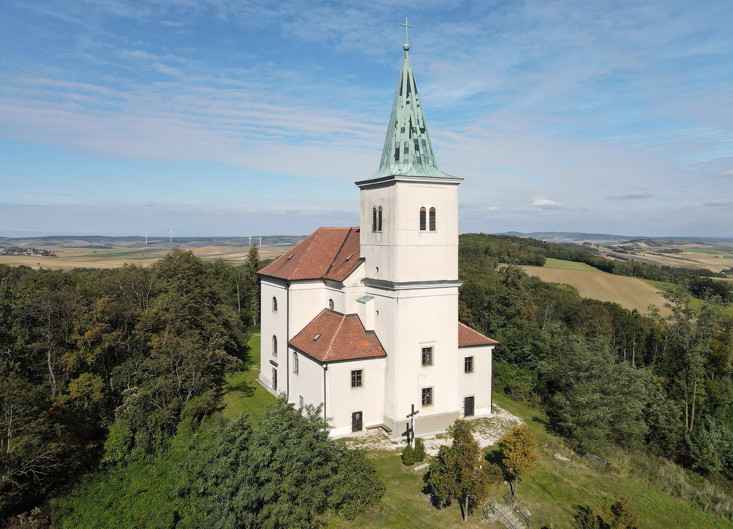 | aktuell | 19:40, 15. Okt. 2021 | 3.830 × 2.763 (7,58 MB) | commons>Bwag | == {{int:filedesc}} == {{Information |Description= {{de|1= Südansicht der röm-kath. Pfarrkirche ''Allerheiligste Dreifaltigkeit'' in Karnabrunn, ein Dorf in der niederösterreichischen Marktgemeinde Großrußbach.<br/>Die Kirche wurde am Gipfel des 358 m hohen Kirchberges bzw. Stainmeißelberges durch Graf Friedrich Julius Bucceleni in den Jahren 1684 bis 1686 errichtet. Der frühbarocke, lisenengegliederte Bau hat einen kreuzförmigen Grundriss und einen wuchtigen, zweigeschoß... |