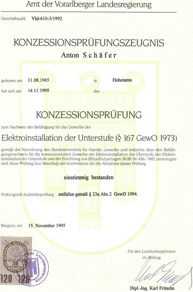 Deutsch: Konzessionsprüfungszeugnis (= Meisterbrief) aus Österreich für das Elektroinstallationsgewerbe der Unterstufe (bis 1000 VAC bzw. 1500 VDC) gemäß § 167 Gewerbeordnung (GewO) 1973 für Anton Schäfer. Ausgestellt von der Vorarlberger Landesregierung am 15. November 1995.