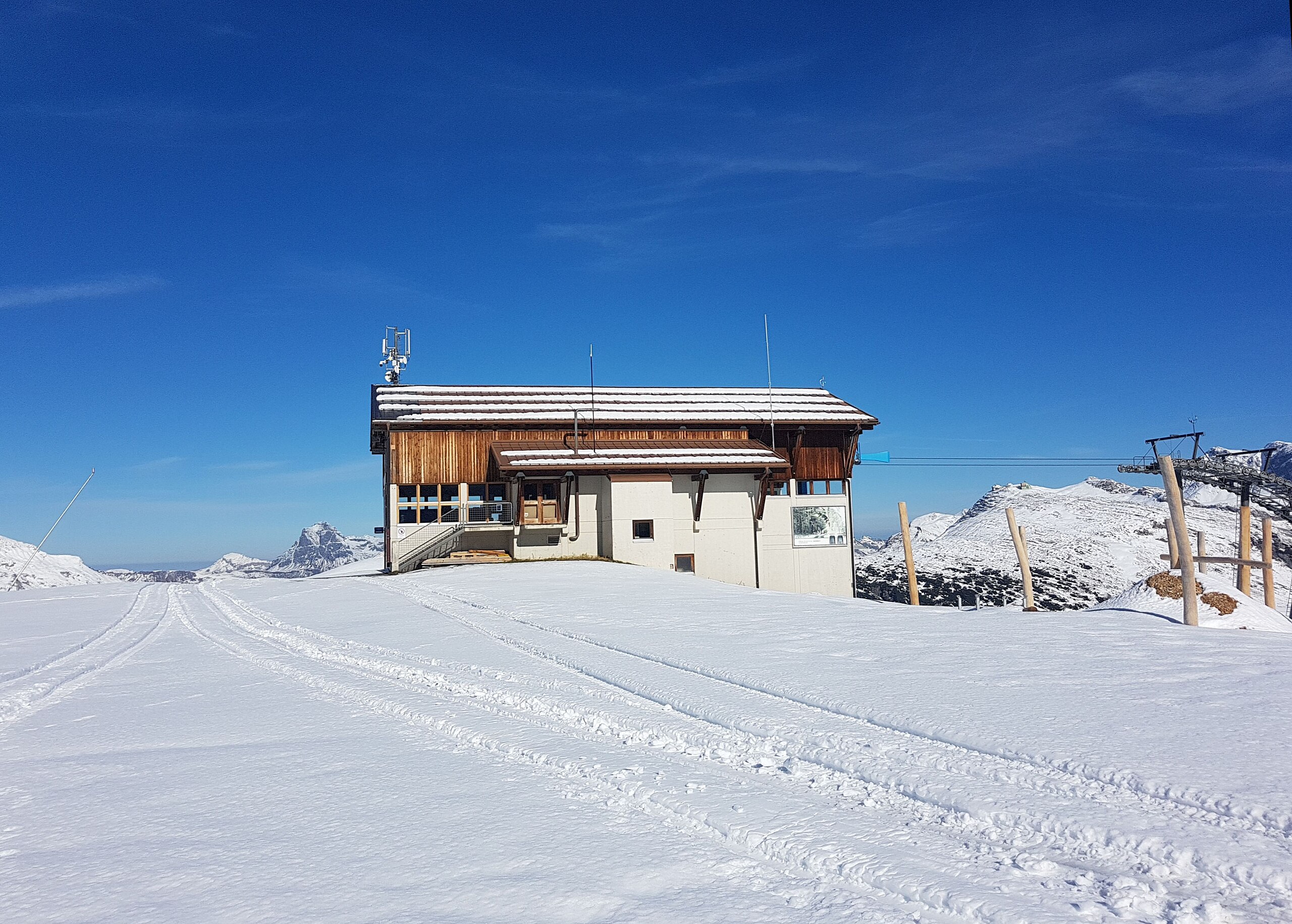 Mountain station of the Seekopfbahn, a 4-seater chairlift in the Zürs district in the municipality of Lech in Vorarlberg, Austria