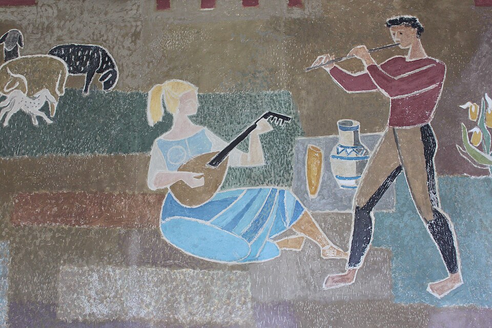 Deutsch: Detailausschnitt Fresko von Leopold Fetz in der Bergstation der Karrenseilbahn, dem Andenken von Viktor Hämmerle gewidmet, von der Stadt Dornbirn