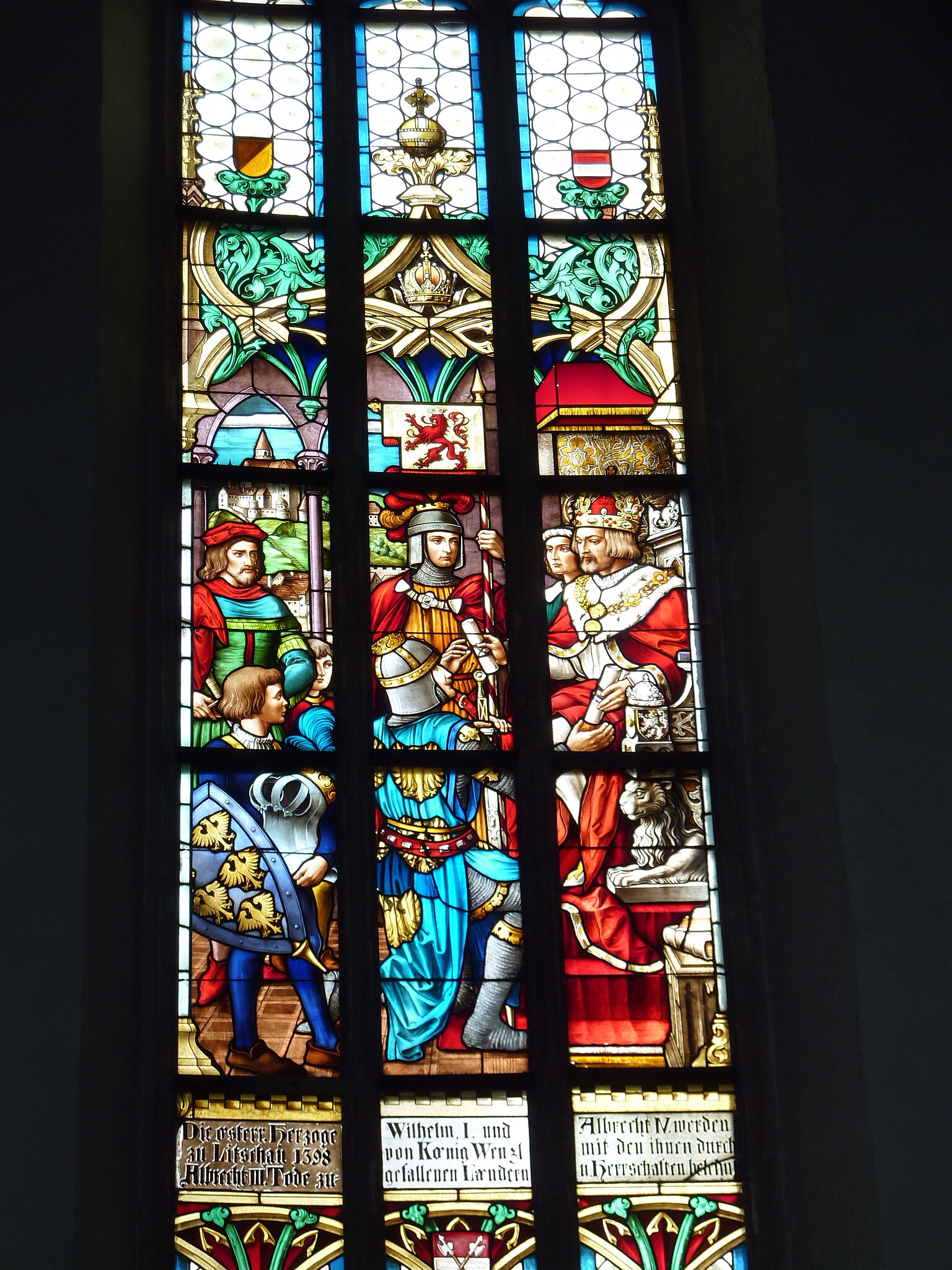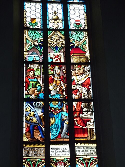 Deutsch: Pfarrkirche hl. Michael in Litschau, Niederösterreich - Glasfenster an der Nordseite des Kirchenschiffes: Belehnung Herzog Wilhelms I. und Albrechts IV. von Österr. durch König Wenzel 1398 in Litschau (Glasmalerei Ostermann und Hartwein (München), 1911/12)