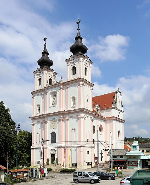 Deutsch: Südwestansicht der Basilika und Wallfahrtskirche Zur schmerzhaften Gottesmutter in Maria Dreieichen, ein Ortsteil der niederösterreichischen Gemeinde Rosenburg-Mold.