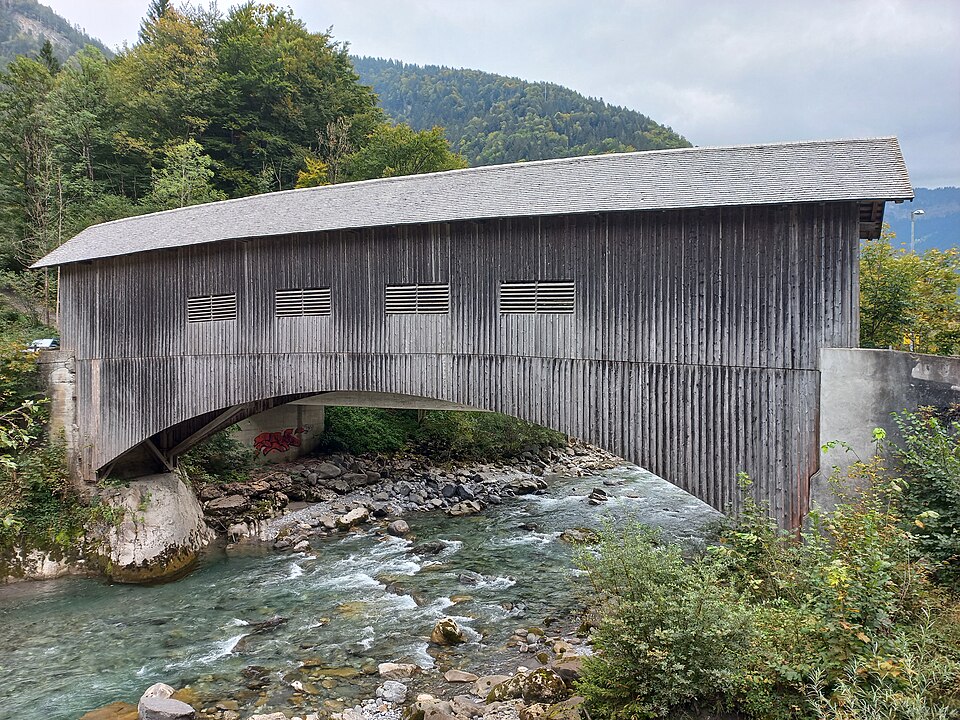 Deutsch: Die denkmalgeschützte Klausbrücke verbindet die Gemeinde Mellau (Ortsteil Klaus) mit der Gemeinde Reuthe (Ortsteil Hinterreuthe) im Bregenzerwald, Vorarlberg, Österreich.