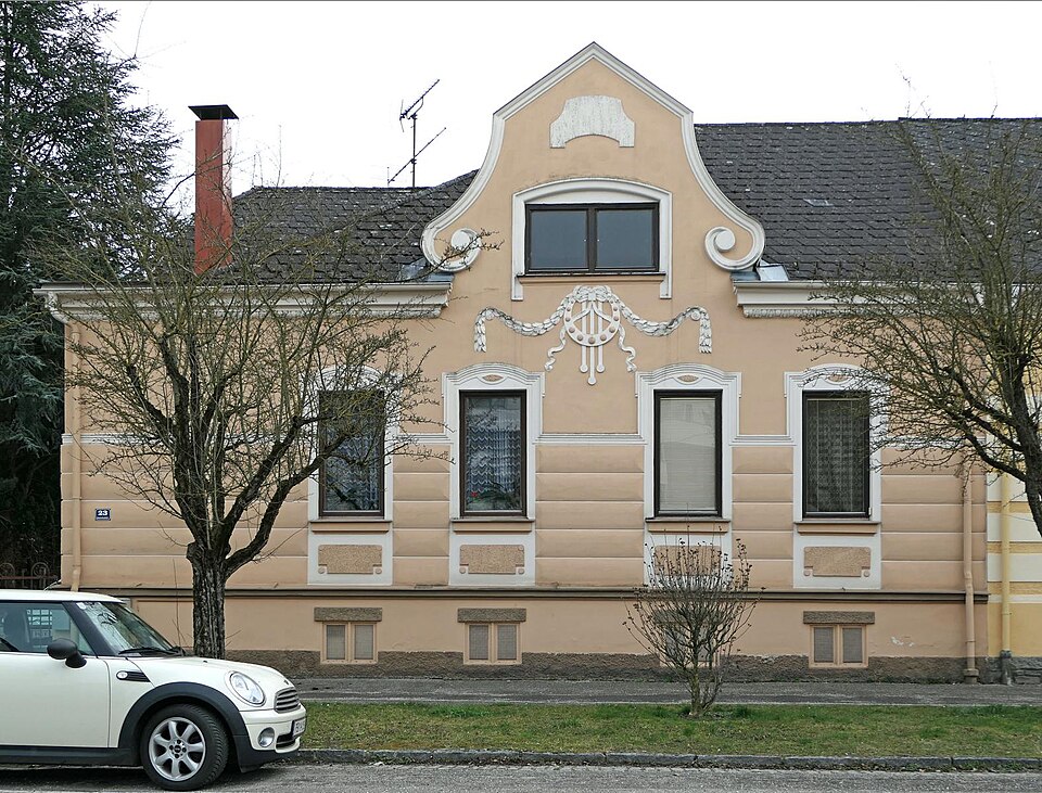 | aktuell | 20:16, 6. Mär. 2020 | 1.577 × 1.200 (364 KB) | commons>TREM-RRRR | {{Information |description ={{de|1=Perg in Oberösterreich. Haus Bahnhofstrasse 23. Erbaut 1908/1909. Von Baumeister Karl Wögerbauer (1878-1950) für sich erbautes Haus. Einfacher Jugendstil. Foto 2020.}} |date =2020 |source ={{own}} |author =User:TREM-RRRR }} Category:Karl Wögerbauer |