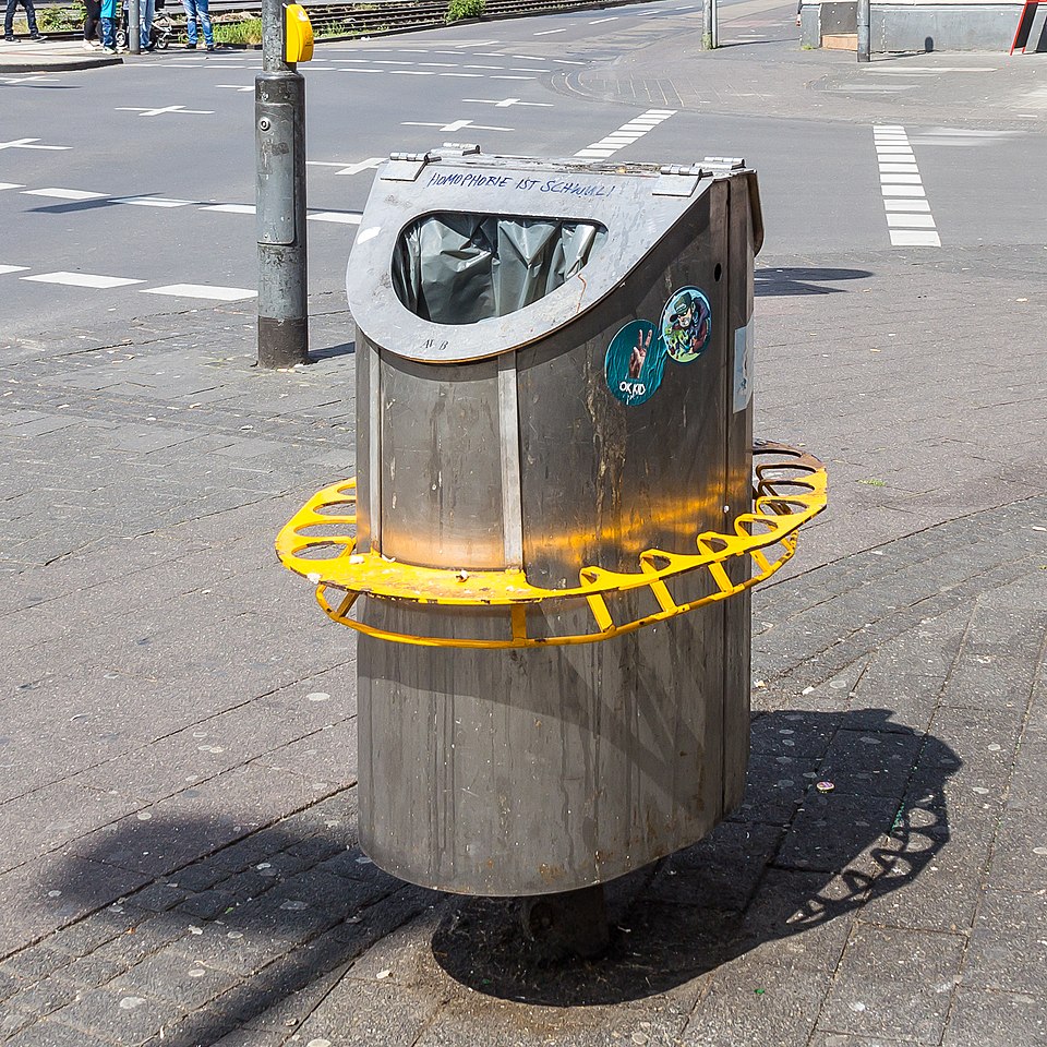 Deutsch: Pfandring, angebracht an einem Abfalleimer Kreuzung Venloer Straße/Ehrenfeldgürtel, Köln-Ehrenfeld. Ergebnis Pilotversuch Pfandringe vom Februar 2016 (unter „Anlage 856 KB“ oben rechts) |