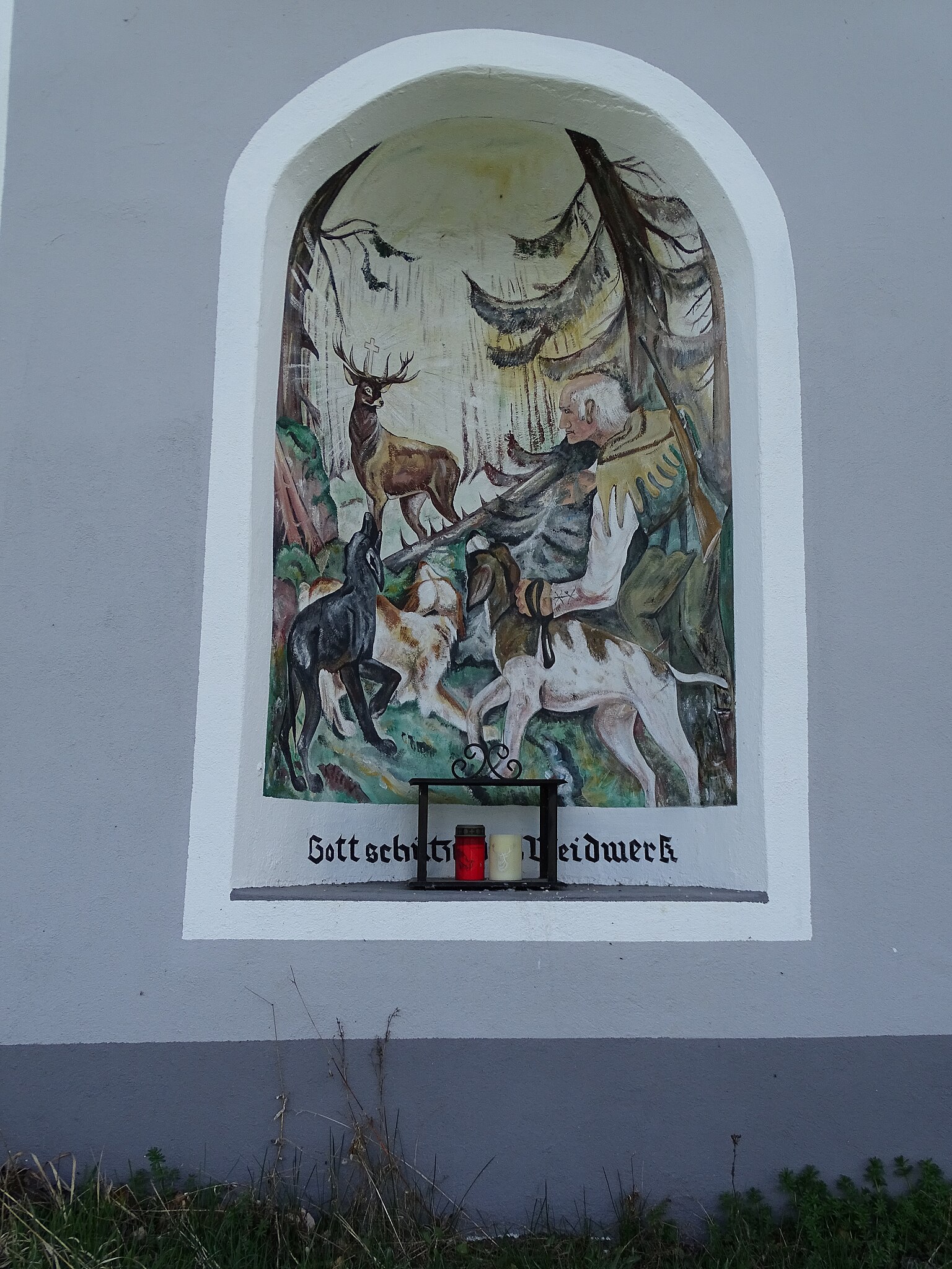 English: Fresco of Saint Hubertus at the Pitrich-Bildstokc in Lichtengg, Sankt Bartholomä |