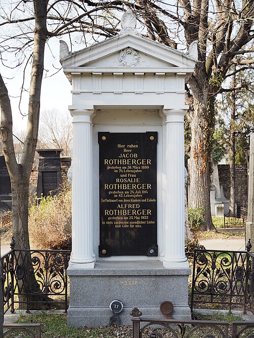 English: Grave of Jacob Rothberger, founder of the former Viennese department store Rothberger, and his family in the old Jewish part of the Vienna Central Cemetery (gate 1, group 20, row 19, number 17) |