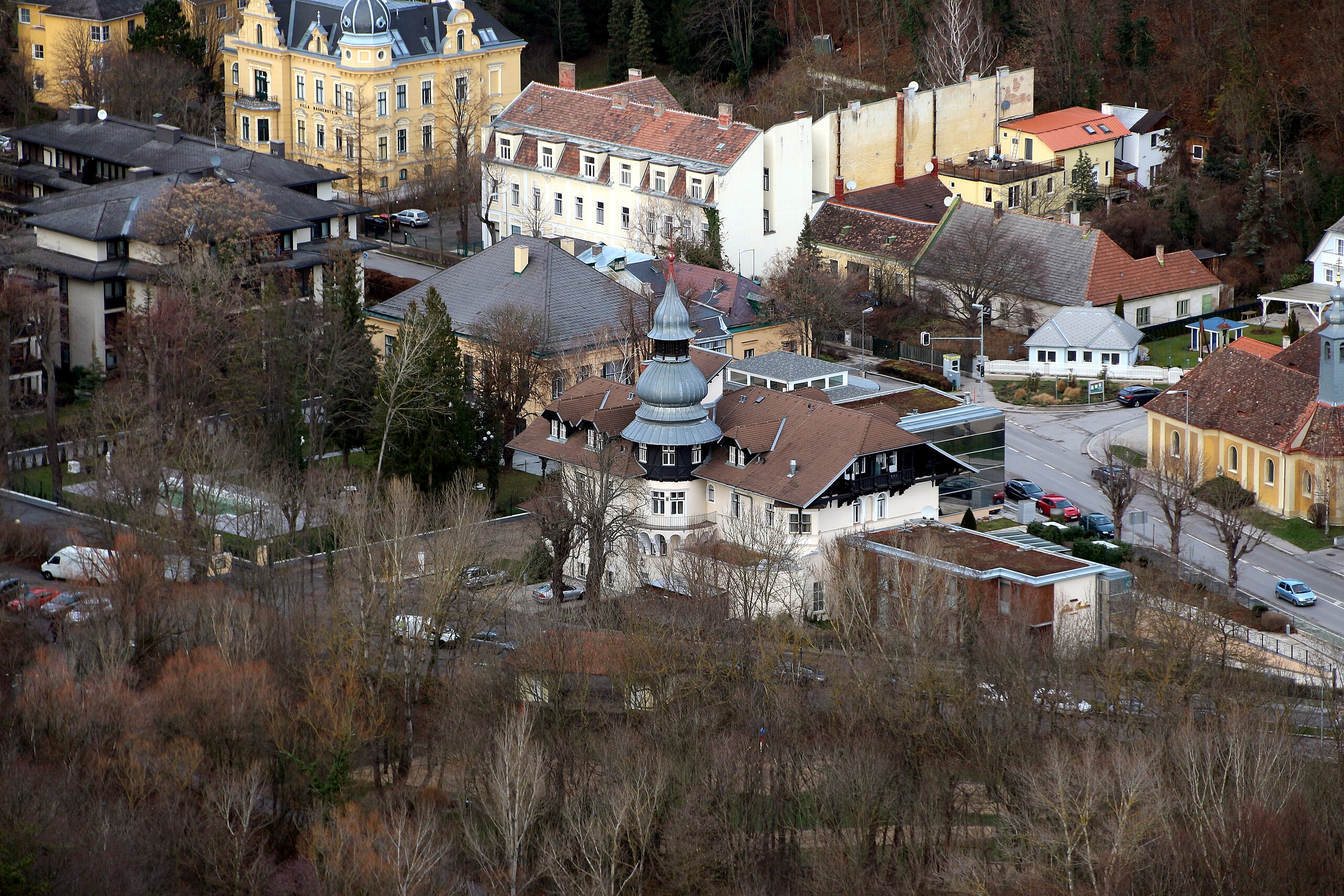 Deutsch: Sacher Hotel in Baden, von der Burgruine Rauheneck (Südosten) aus gesehen.
