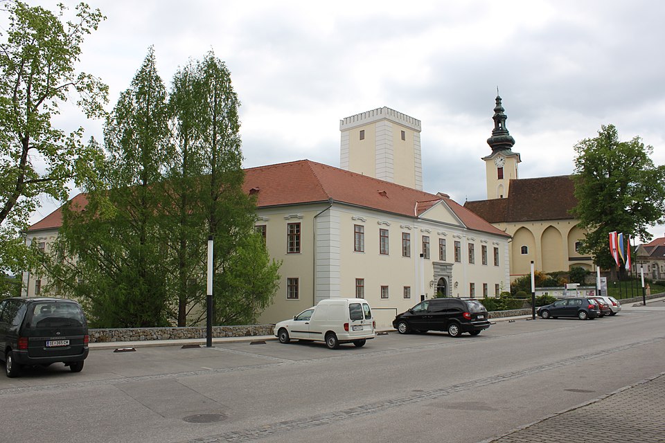 Deutsch: Schloss St. Peter in der Au, im Hintergrund die Pfarrkirche Hll. Petrus und Paulus