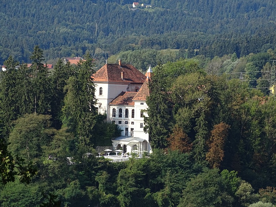 Deutsch: Blick von der Burg Obervoitsberg auf das Schloss Greißenegg |