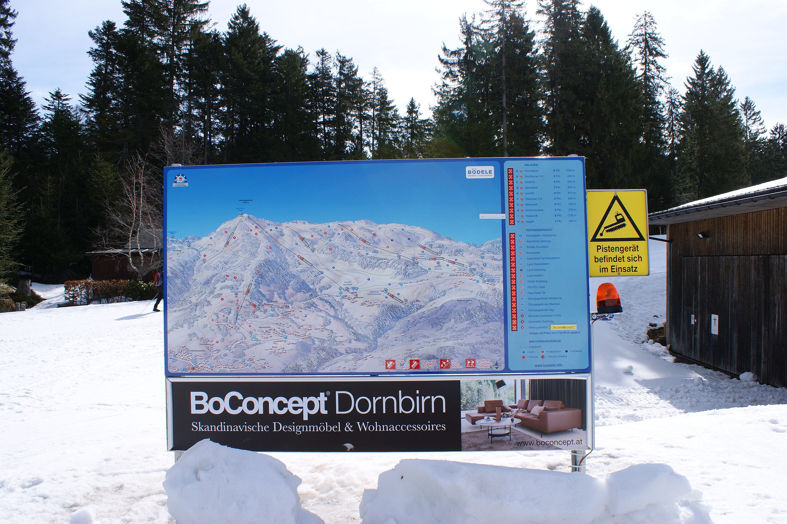 Deutsch: Skipisten Warn und Hinweisschilder/Informationstafeln im Skigebiet Bödele-Hochälpele-Schwarzenberg in Vorarlberg, Österreich.