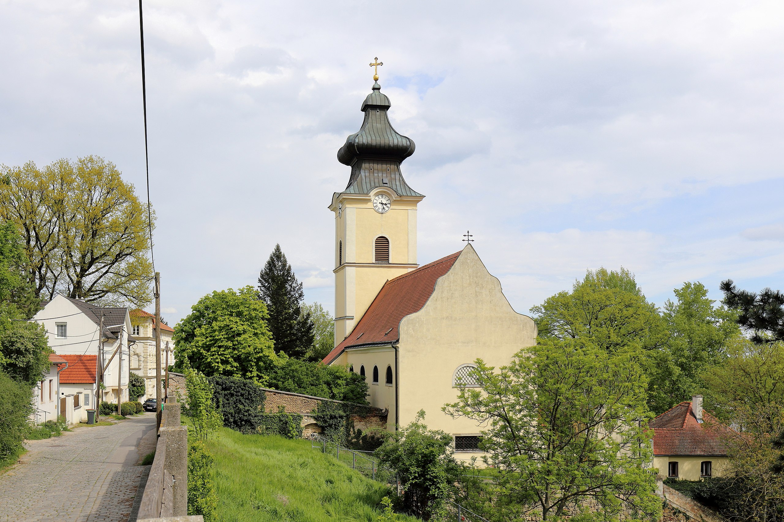 Obwohl kriegsbedingt die Kirche oftmals zerstört wurde (1484 Ungarn, 1645 Schweden, 1529 und 1683 Osmanen), hat sich ältere Bausubstanz, die bis zur Romanik zurückreicht erhalten. Das Langhaus wurde im 17. Jahrhundert erbaut und im 19. Jahrhundert erweitert. Der Ostturm und der Chor waren ursprünglich gotisch. Nach einem Großbrand im Jahr 1850 kam es zu einer tiefgreifenden Renovierung bzw. Umbau. |