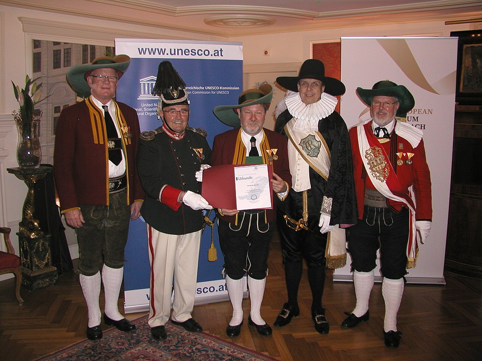 Deutsch: Die Hauptmänner der vier Sakramentsgarden von Tirol und in der Mitte Herr Karl Wurzer bei der Verleihung des immateriellen Kulturerbes der UNESCO Österreich am 14. November 2013 in der Hofburg (Cafe Sacher) in Innsbruck |