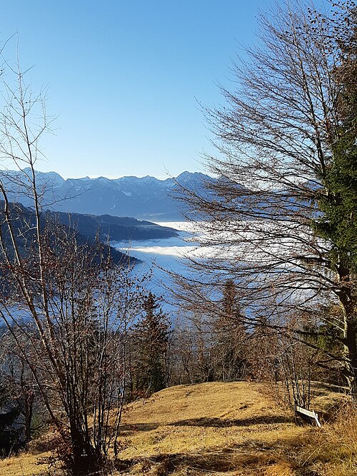 Deutsch: Das Schlattegg-Letze ist ein Trockenbiotopkomplex mit bunten, blumenreichen Halbtrockenrasen und einem für Vorarlberg seltenen Traubeneichen-Reinbestand in der Gemeinde de:Viktorsberg in Vorarlberg (Österreich). Das Biotop ist 25,13 Hektar groß. Blick ins neblige Alpenrheintal.