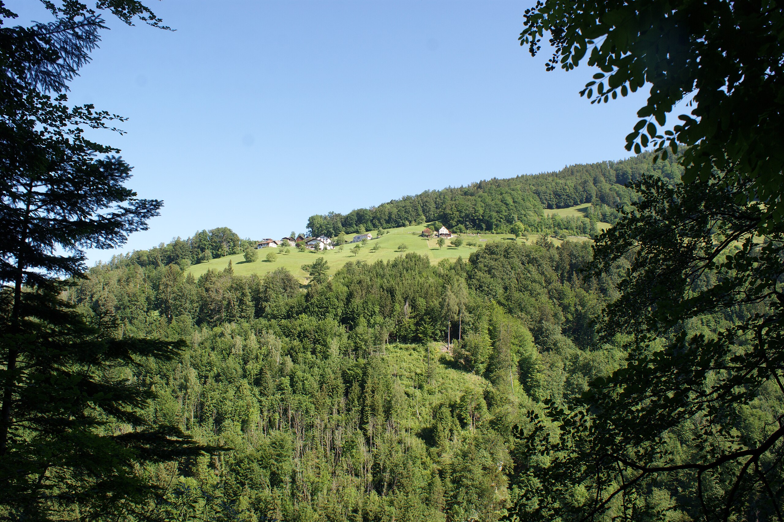 Blick vom Masellaweg (alpiner Wanderweg) nach Viktorsberg (Schlattegg/Rüti)