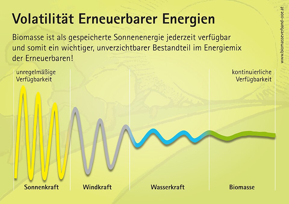 Deutsch: Die Grafik zeigt, dass die Verfügbarkeit von Energie aus Biomasse deutlich höher und gleichmäßiger als bei anderen erneuerbaren Energieträgern ist.