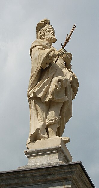 English: Kath. Pfarrkirche Schmerzhafte Maria auf dem Weizberg, Weiz, Styria. Statue of Saint Donatus as part of the double stairs. Deutsch: Kath. Pfarrkirche Schmerzhafte Maria auf dem Weizberg, Weiz, Steiermark. Statue des hl. Donatus als Teil der Stiegenanlage.