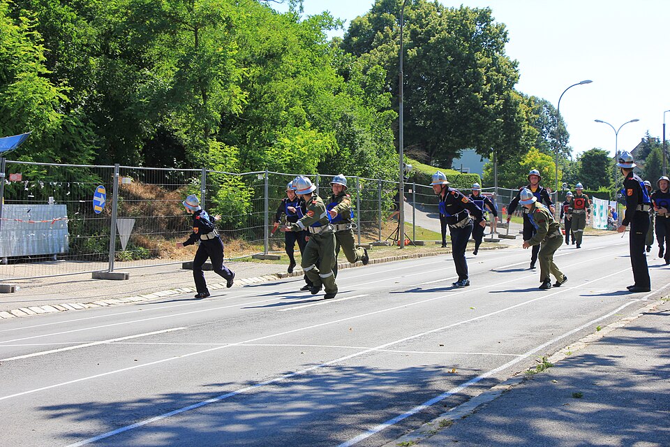 Deutsch: Der zweite Teil des Bewerbs besteht aus einem Staffellauf, bei dem das Strahlrohr jeweils weitergegeben werden. Dazu wird die de:Mistelbacher Straße "missbraucht" |