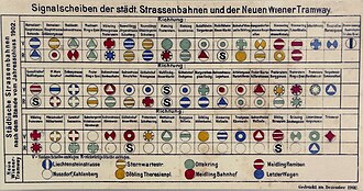Bereits 1873 oder 1874 wurde die Kennzeichnung der letzten Wagen der Wiener Tramway-Gesellschaft (WT) mittels blauer Scheibe, möglicherweise zusätzlich zum damals ebenfalls färbigen Liniensignal, vorgenommen. Diese Farbe wurde vermutlich deshalb gewählt, da sie als einzige bei den damals auch noch mit vollfärbigen Gläsern vorgenommenen Liniensignalisierungen nicht mehr in Verwendung stand. Als die Linien mehr wurden und man mit einfärbigen Scheiben nicht mehr das Auslangen fand, kamen auch verschiedenfarbige grafische Symbole in Verwendung, für die dann in den Fünfziger Jahren von Tramwayfreunden eher scherzhaft der Ausdruck Hieroglyphen geprägt wurde. Offiziell hießen sie immer nur Liniensignale oder Signalscheiben. Die Neue Wiener Tramwaygesellschaft (NWT) übernahm ebenfalls diese Kennzeichnung der letzten Wagen und erweiterte sie noch durch die Kenntlichmachung der vorletzten Wagen mittels einer nur zur Hälfte blauen Scheibe (unten weiß, oben blau).