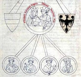 - Herzogin Agnes von Österreich († 1364) ⚭ (1296) mit König Andreas III. von Ungarn († 1301). Ihre Hochzeit soll in Wien stattgefunden haben.[7] Ihr Ehemann hatte sich bereits nach Angaben in mittelalterlichen Chroniken zwischen dem 10. und dem 28. Juli 1290 in Wien, je nach Quelle als Gast oder Gefangener seines späteren Schwiegervaters, aufgehalten. Von reiste er im Juli 1290 zu seiner Krönung nach Stuhlweißenburg, nach einigen Quellen soll er als Mönch verkleidet über die Donau von Wien nach Ofen geflohen sein.[8]