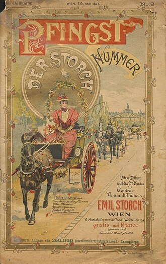 Zugleich startete Storch eine exzessive Werbekampagne, die ihm zuweilen Schwierigkeiten mit dem Presserichter einbrachten[8]. Sehr erfolgreich war er auch mit dem Versand seines Bestellkataloges mit dem Titel „Familien- und Unterhaltungsblatt – Der Storch“, welchen er anfänglich monatlich, später alle zwei Wochen, in einer Auflage von 100.000 Exemplaren bis in die entferntesten Ecken der Donaumonarchie ab 1887 verschickte. Breits im Jahre 1893 hatte Storch 140. 000 Kunden und im Jahre 1897 fanden 250.000 Bestellkataloge in deutscher und ungarischer Sprache ihren Weg zu seinen Kunden.