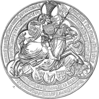 - 1411-1417 führte Ernst mit dem Adeligen Reinprecht (II.) von Wallsee, der ein Vertrauter von Albrecht V. war, die Wallseer Fehde.[15] Von den Auswirkungen dieser Fehde waren besonders zu Beginn auch die Herzogtümer Steier und Kärnten betroffen. Während sich Reinprecht im Herzogtum Österreich behauptete, musste er auf Teile seiner Lehen in den von Ernst beherrschten Herzogtümer (besonders in der Krain), die ihm durch Erbschaft zugefallen waren, verzichten.[16]