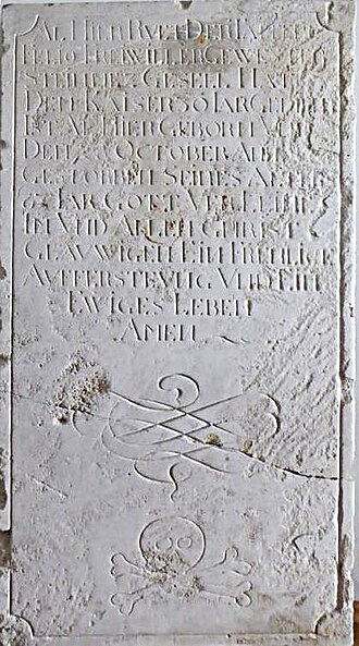 „ALHIER RUET DER TAPFERE / FELIX FREYWILLER GEWESTER / STEINMEZ GESELL HAT / DEM KAISER 30 JAR GEDIND / IST ALHIER GEBORN UND / DEN 28. OCTOBER ANNO 1726 / GESTORBEN SEINES ALTERS / 67 JAR. GOTT VERLEIHE / IM UND ALLEN CHRIST / GLAUWIGEN EIN FREHLICHE / AUFERSTEUNG UND EIN / EWIGES LEBEN. / AMEN“