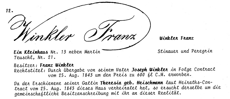 - So wusste es jüngst verstorbener Franz Winkler, mein Altersgenosse, nicht, dass der Name einer seiner Ur-Stammväter als noch nicht ausgestorbener Stamm, als Wohltäter zuletzt aufgeschrieben steht.[7]