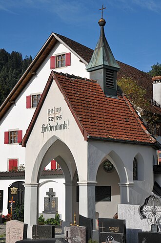Im Dezember 1925 wurde in der Gemeindevertretung die Errichtung eines Kriegerdenkmals besprochen. Pfarrer Johann Gabl drängte 1927 auf die Errichtung eines solchen Kriegerdenkmals auf dem neuen Friedhof und der Fertigstellung des Arkadenbaues (die Fertigstellung der Arkaden erfolgte 1930). Daraufhin wurde über Antrag des Friedhofkomitees im Juli 1927 eine öffentliche Volksversammlung im Gasthaus zur Krone abgehalten, um über die Errichtung eines Kriegerdenkmals zu beraten. Daraufhin wird beschlossen, die im neuen Friedhof geplante Friedhofkapelle als Kriegerdenkmal zu gestalten. Weil die Finanzierung unsicher war, konnte das Kriegerdenkmal erst am 9. August 1931 feierlich enthüllt werden. Es wurden zur Realisierung der Kosten von rund 7400 Schilling Haussammlungen durchgeführt.