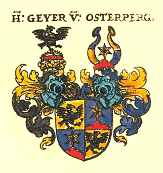 Die Familie Geyer, später Geyer von Geyersberg, war eine Ritterfamilie aus der Reichslandschaft Franken, die im letzte Drittel des 15. Jahrhunderts ins heutige Niederösterreich kam, wo sie in den Jahren danach eine ganze Reihe von Besitzungen erwarb und sich in mehrere Familienzweige aufteilte.[1] 1514 kaufte der Ritter Hans Geyer die Osterburg (heute Teil der Gemeinde Haunoldstein) im Dunkelsteinerwald als landesfürstliches Lehen, die einer ihrer Hauptsitze wurde.[2] Nach dem Erwerb eines landesfürstlichen Landgerichts verlegten sie dieses 1584 dorthin. Während der Reformation wurden die meisten Familienzweige der Geyer protestantisch. Sie musste nach der Schlacht am Weißen Berg (8. November 1620) das Habsburgerreich verlassen.[2] 1650 wurde der katholische Zweig der Familie in den Freiherrenstand erhoben und führte dann den Namen Geyer von Geyersberg auf Osterburg.[1]
