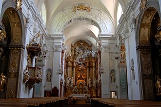 Die "Gnadenstatue Unsere Liebe Frau von Mariabrunn" ist heute das Zentrum des Hoch- und Gnadenaltars (1730er-Jahren) der früheren Klosterkirche "zur Heiligen Mariä Heimsuchung", der heutigen Pfarrkirche Mariabrunn oder Wallfahrtsirche "zu Unserer Lieben Frau".[2] In dem barocken Brunnenhaus neben der Kirche, das über jener Heilquelle[A 2] errichtet wurde, welche dem Kloster den Namen gegeben, befindet sich heute eine Kopie der Gnadenstatue im Prunkgewand aus Sandstein, die im 1655 geschaffen wurde.[1]
