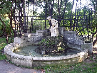 - der Jungbrunnen (aufgestellt seit 1913): Er befindet sich am anderen Ende des Parks unterhalb der Schönbrunner Schlossbrücke und ist ein Werk des Bildhauers Rudolf Panholzer.[1] Er besteht aus der Skulptur eines nackten Mädchens, das auf einem Felsen kauert und mit der hohlen Hand Wasser aus einem kleinen ovalen Becken schöpft. aus diesem Becken rinnt das Wasser des Brunnens über den Felsen hinab in ein halbrundes größeres Becken. Die Rückwand des Brunnes ist mit Blumenbehältern und Ornamenten verziert. Auf dem Brunnenbecken findet sich die Inschrift: "Jungbrunnen. Errichtet 1913". Der Brunnen wurde in der Nacht vom 4. auf den 5. Oktober 1948 durch unbekannte Täter schwer beschädigt. Dabei wurde der Mädchenskulptur der Kopf abgeschlagen. 1949 wurde der Brunnen vom Bildhauer Adolf Wagner von der Mühl repariert. 1954 musste die Mädchenfigur wegen der damaligen Beschädigung erneut restauriert werden.[2]