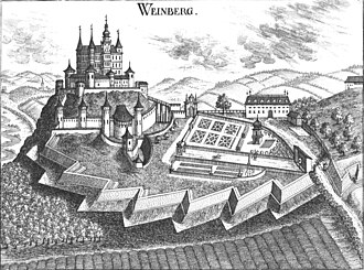 An Hans Wilhelm von Zelking und seine beiden Ehefrauen erinnern die Allianzwappen über dem Eingang des Rittersaales von Schloss Weinberg, der auch als Kaisersaal bezeichnet wird.[4] Diesen ließ Hans Wilhelm zwischen 1610 und 1617 errichten, wobei er sich bei der Innengestaltung um 1600 sich von Reichardt Strein von Schwarzenau († 1600) beraten ließ.[27] An den Wänden ließ er die Wappen sämtlicher Familienmitglieder, die im 15. Jahrhundert gelebt hatten, anbringen.[28]