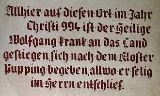 - Pupping: Pupping ist der Sterbeort des Heiligen Wolfgangs. Der Legende nach soll er vor dem Altar der dort um 866 erbauten Kapelle, die dem Heiligen Othmar geweiht war, gestorben sein. Sein Herz und seine Eingeweide wurden in dieser beigesetzt. Beim später erbauten Kloster von Pupping befindet sich heute eine Kirche, die dem Heiligen Wolfgang geweiht ist. Außerdem wurde in Brandstatt bei Pupping eine St.-Wolfgang-Kapelle errichtet, angeblich an jener Stelle, wo der Heilige das Schiff verließ, mit dem er aus Passau angereist war.