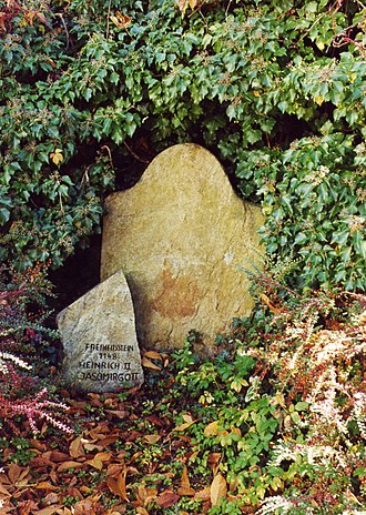- Nach seinem Tod wurde der Herzog im Schottenkloster beigesetzt.[32] An der auf der Südseite gelegenen Außenwand der Stiftskirche befindet sich seit 1652 der Heinrich-Jasomirgott-Brunnen. Die dortige Statue des Herzogs ist ein Werk des Bildhauers Josef Breitner († 1930) aus dem Jahr 1893.