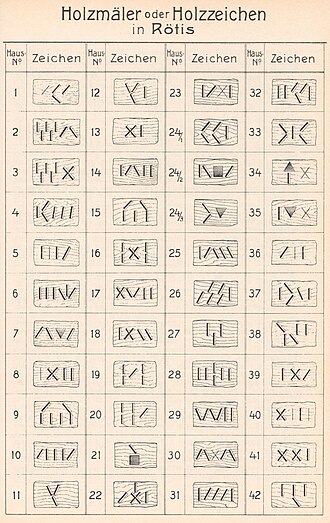- ↑ Die um 1900 noch in Verwendung stehenden 124 Holzmäler oder Holzzeichen der verschiedenen Haushalte von Röthis wurden bei Georg Keckeis in: Röthis und Viktorsberg, Bregenz 1908, S. 92-93 aufgeführt.